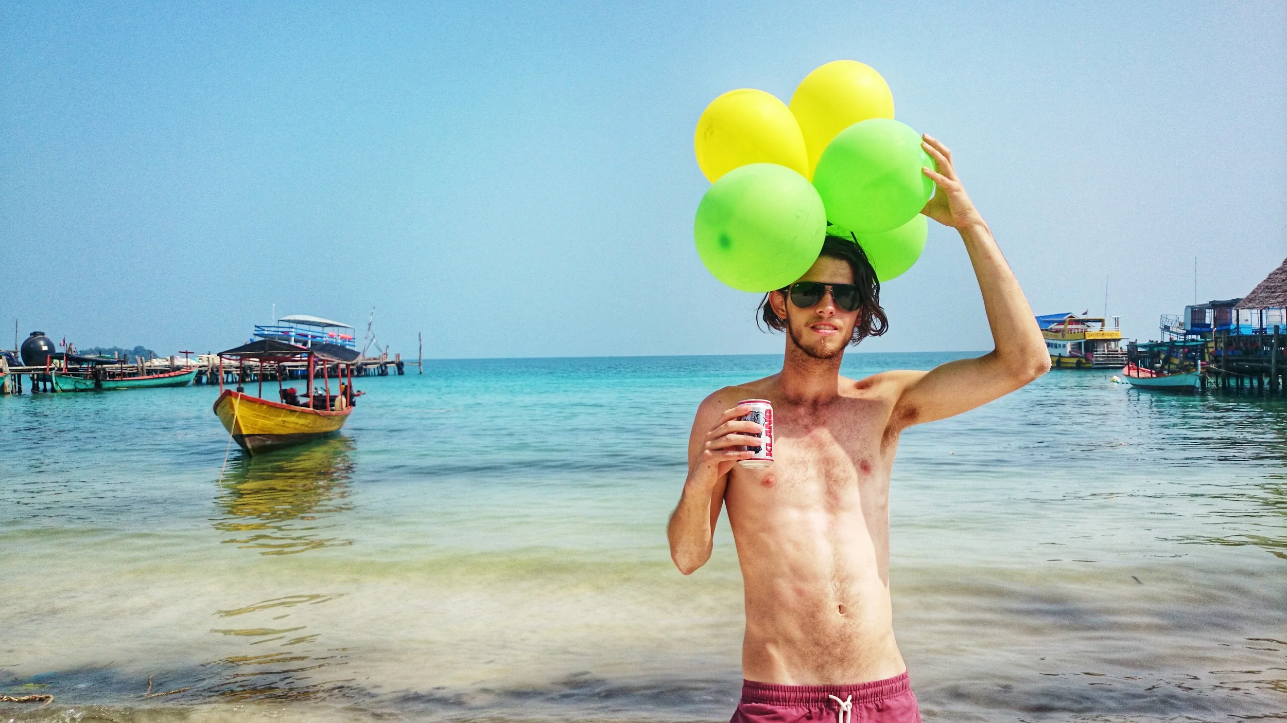 The cheery, bearded owner of Island Boys is Australian and he’s stapling yellow and green streamers on any available surfaces: poles, doorways, the stairwell, the ceiling. Balloons bounce past the legs of bar stools and down the hall toward the dorms. The French girl has lined up five shots, now. She and I glance at my three Aussie companions, who aren’t paying attention. It’s their third shot of the day. They sip Klang (a cheap Cambodian beer) casually and joke about the music, unconcerned of the unreasonable hour and the dangerously strong shot they’re about to consume. One finally notices my gaze and snatches his Wet Pussy off the bar.